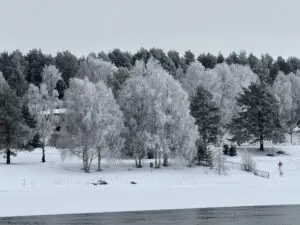 This is why it is imperative for you to make plans for during the day. There is just enough for anyone to see in Rovaniemi to keep you occupied and interested. Downtown is just a few blocks but is interesting and the riverside is gorgeous. The photo below of the trees with snow is in color! Amazing.